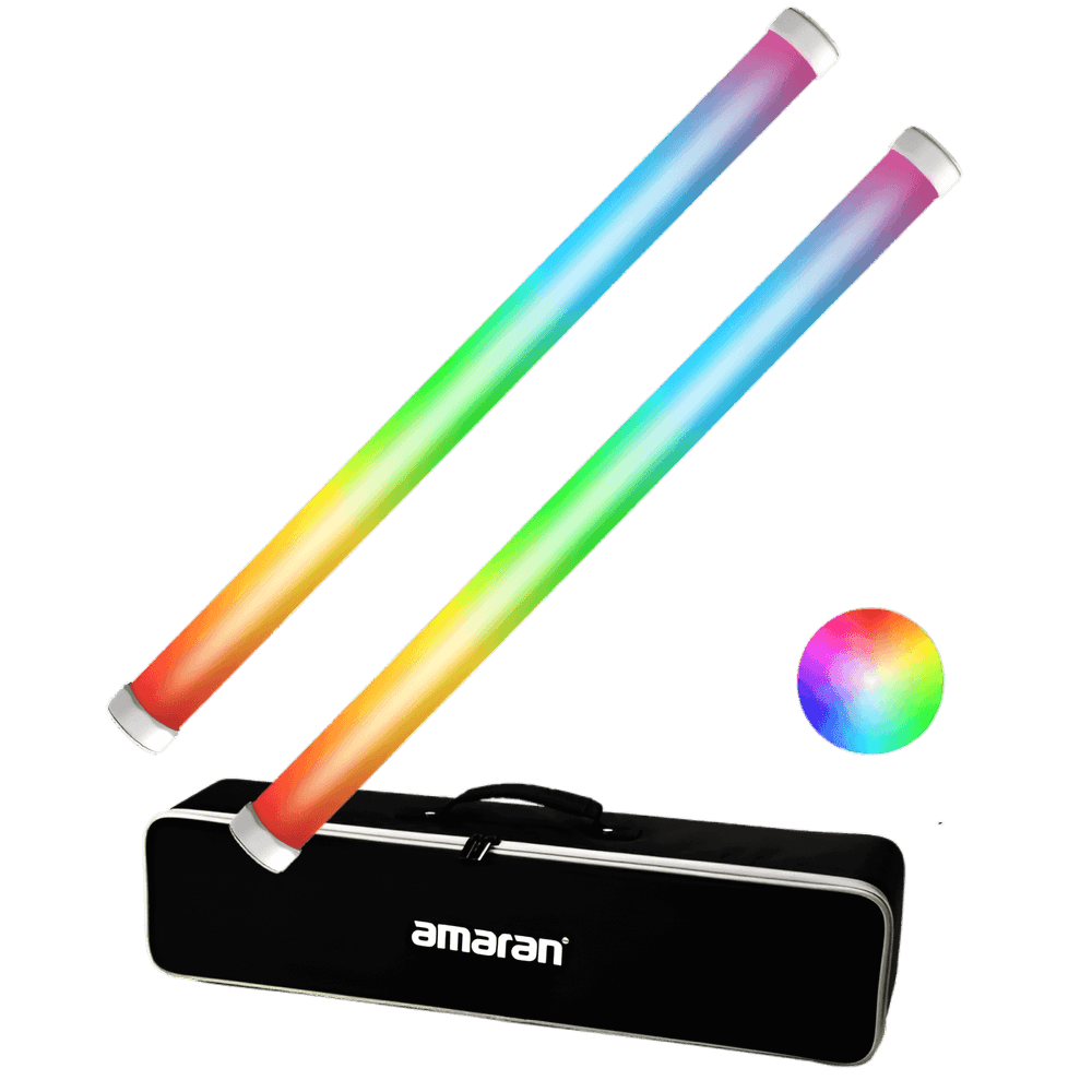Este kit de produção PT2c de 2 luzes da amaran combina um par de versáteis tubos de LED pixel de 60 cm e adiciona um par de adaptadores USB-C para DMX para controle sem fio expandido. Cada luz vem com um suporte de chão e há um estojo para facilitar o transporte e o armazenamento.