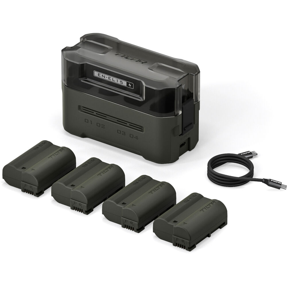Este Kit EN-EL15C da Tilta inclui quatro baterias Tilta EN-EL15C recarregáveis via USB-C, uma estação de carregamento portátil e um cabo USB-C.