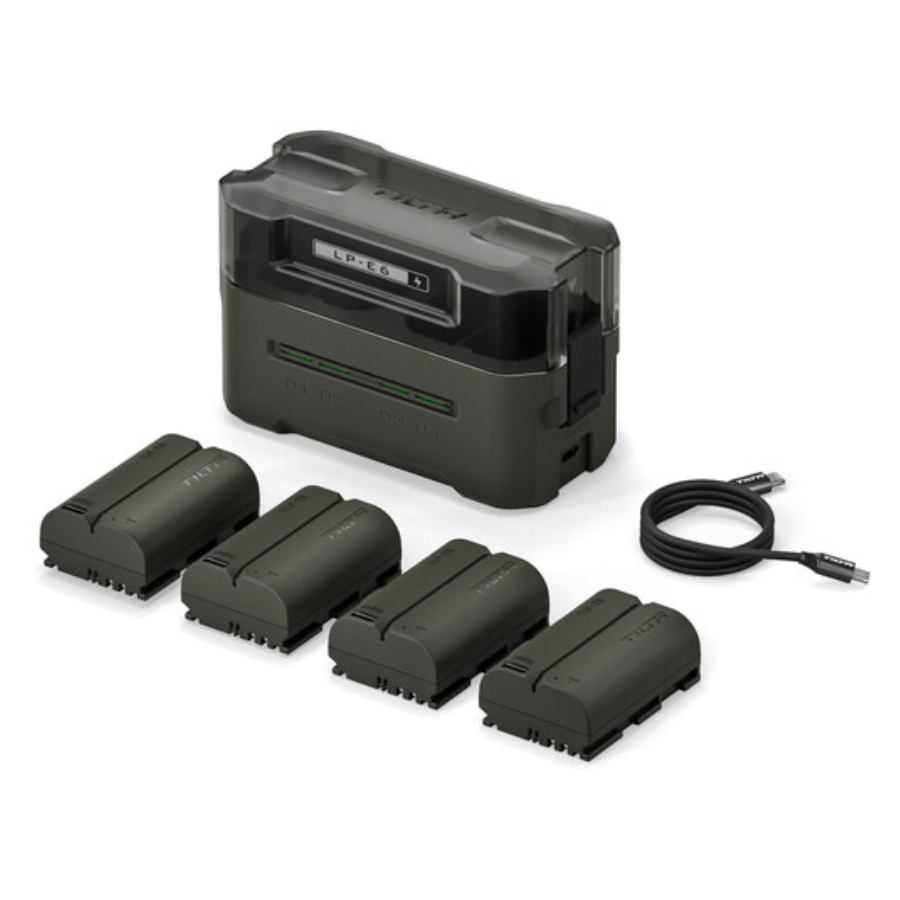Este kit LP-E6P verde da Tilta vem com quatro baterias recarregáveis Tilta LP-E6P, uma estação de carregamento e um cabo USB-C. A estação de carregamento portátil requer um adaptador de energia (vendido separadamente) com potência mínima de 45 W para obter os tempos de carregamento mais rápidos.